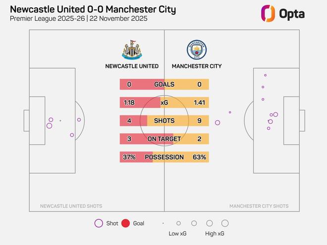 对此来自Opta的统计指出,纽卡和曼城上半场合计浪费了7次绝佳机会,其中纽卡4次,曼城3次,这是英超自2010-11赛季以来,所有上半场以0-0结束的比赛中两队绝佳机会合计数量最多的一场。
