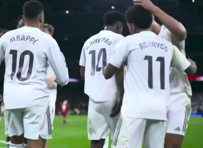 下半场,客队的马尔考早早被罚下,皇马多打1人,比赛基本失去悬念。第85分钟,罗德里戈禁区内突破被踢倒在地,皇马赢得点球机会,随后姆巴佩主罚破门,比分锁定为2-0。加上这个进球,姆巴佩今年打进59球,他也追平了C罗在皇马的年度进球纪录。